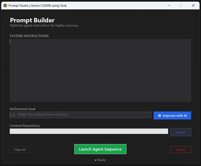 Axiom CODAR built this whole project from the start! Its not yet finished. Based entirely on XAI's Grok LLM, it uses C# as a super smart Agent that can do pretty much anything in the directory the Agent is given. The Agent is restricted to this directory only, for security reasons.