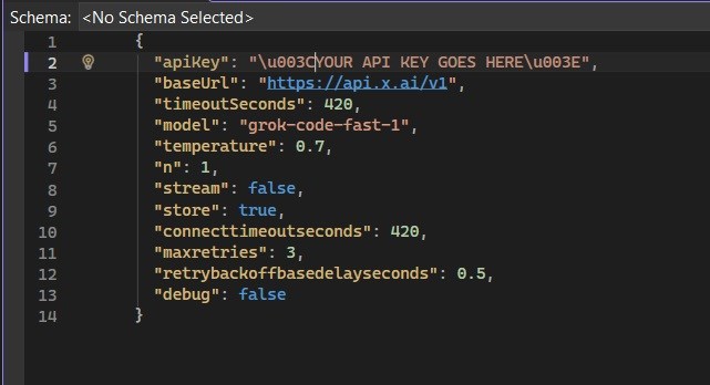 The first time you open Axiom CODAR, a Directory needs to be set, this is your working directory. The second time, it opens the base directory if no Api Key is present. You will see a file: "grokconfig.json" - You need to open this file in your favorite text editor, and add your XAPI Key, get it from here: https://docs.x.ai/developers/quickstart#step-2-generate-an-api-key