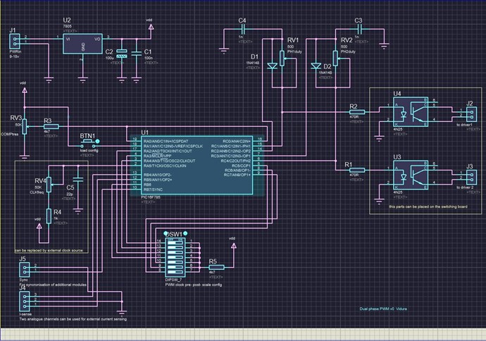 This Is a Project I am working on actually for a dual phase PWM with combined analogue and digital features. It is based on an enhanced 8bit MC, the PIC16F785 with specific peripherals, like a dual phase PWM module and two hi speed comparators, which are used for analogue duty cycle adjustment with infinite resolution. This MC can run on different internal and external oscillator sources, up to 20Mhz, the PWM clock is derived from the system clock, theoretical up to a maximum of 2,5Mhz; practically with reasonable resolution i have tested up to 200Khz with this MC. To overcome the limited period resolution I will use an adjustable external oscillator to clock the MC, which in combination with the pre-and post-scaler in software should allow an infinite period resolution over a wide range of frequencies as well. This features I believe will be helpful to drive resonant LCR circuits, using half- or full-bridge switches with the possibility to trigger magnetic resonance. The signals can be configured as free running two phase signal with independent adjustable duty cycles, or as complementary drive signals with programmable deadtime or overlapping. A synchronization feature allows to connect various MC in parallel in order to add more phases if needed.