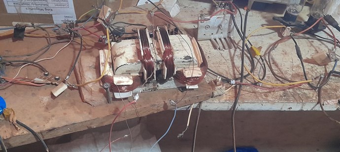 One side of the output coil is loaded with a 25W 250V incandescent bulb, the other output coil has metal Oxide Varistor rated at ..460volts. iam looking for what the Meg responds best with i have several MOVs rated at different voltages to test. I also observed currents in the output coils.